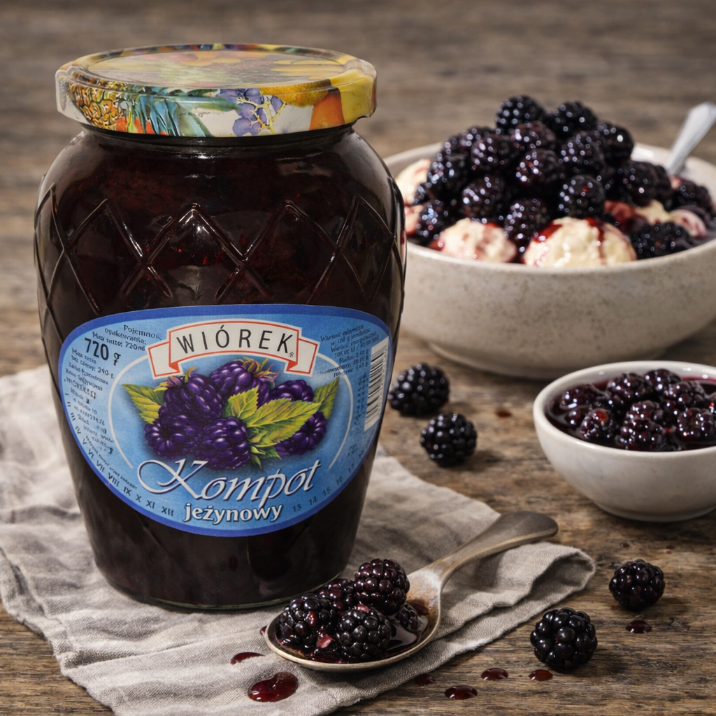 Kompot jeżynowy Wiorek to naturalny napój przygotowany z dojrzałych polskich jeżyn według tradycyjnej, domowej receptury. Charakteryzuje się intensywnym kolorem oraz wyrazistym, słodko-kwaśnym smakiem, który przywołuje wspomnienie słonecznego lata. Jego wyjątkowość została doceniona już w 2007 roku wpisem na Listę Produktów Tradycyjnych, co potwierdza autentyczność i regionalny charakter tego kompotu.